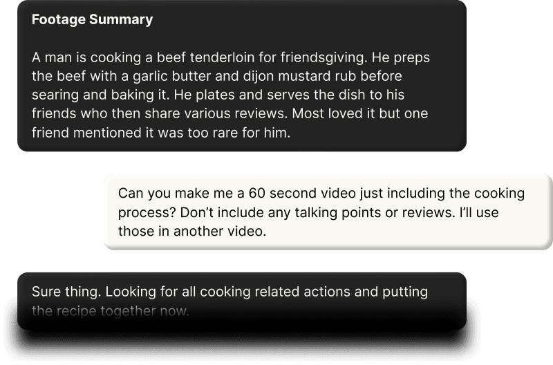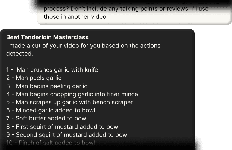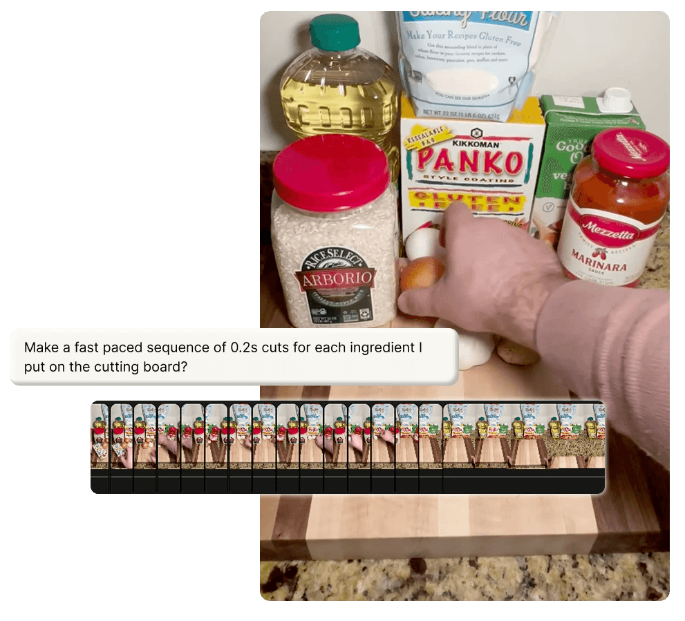 Edit 10X faster with an AI video editing assistant that understands ingredients, actions, and recipes.