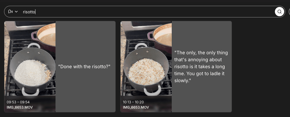 Each search result shows a thumbnail preview, timestamp, and either a visual match or the spoken words that matched your query. You can:
