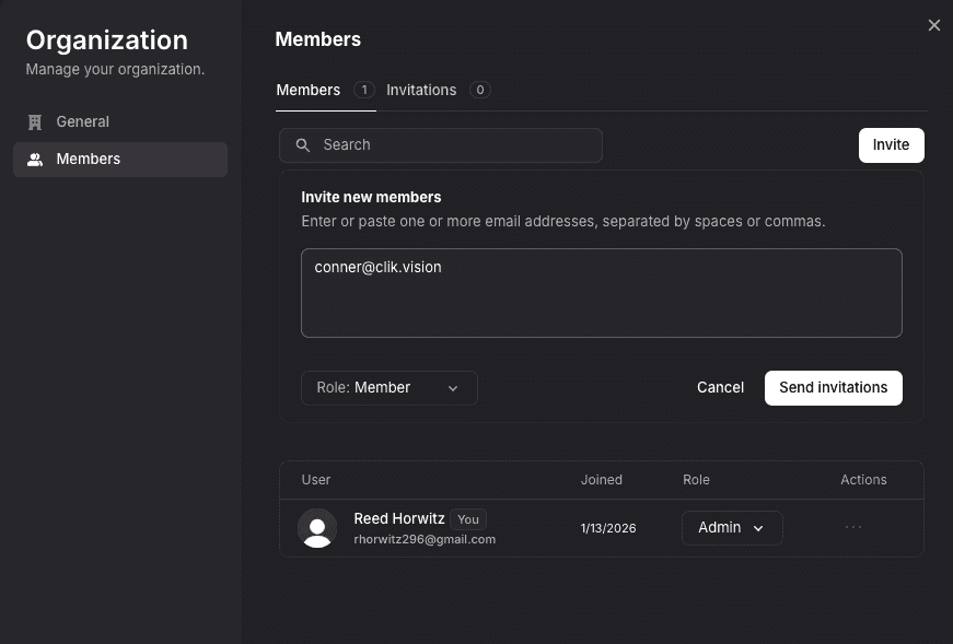 You'll be prompted to enter your teammate's email address. They'll receive an invitation to join your workspace and can accept it by creating a Clik account or signing in with their existing account.