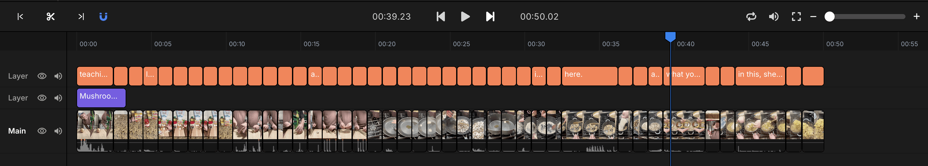 The timeline is where you make precise, frame-accurate edits to your video. While conversation editing and search help you work quickly, the timeline gives you complete control over every clip's position, duration, and arrangement.
